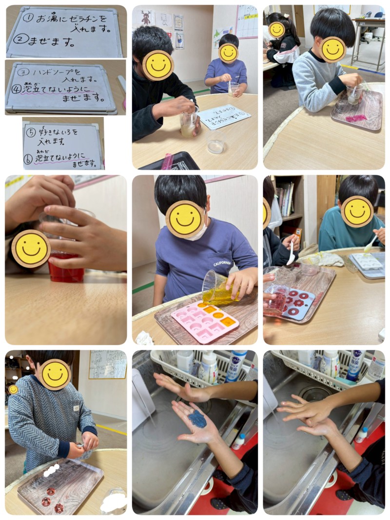 ゼラチンを使ってグミ石鹸を作りました。 ゼラチンの匂いを嗅いだり、ゼラチンは何からできているのか?との疑問も出ました。 注意事を見ながら順番通りに工程を進めます。 型に入れて固めて、翌日手洗いをしてみました。
