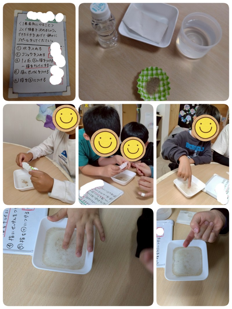 細菌が増殖する時期でもあるので、もう一度手洗いについて学びました。 コショウをバイ菌に見立てて、石鹸使用前後では付きがどう違うのか? しっかりと洗った手洗いを身につけましょうね。