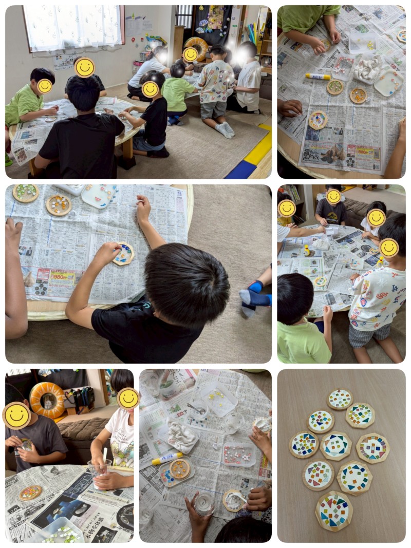 2025.8.1(金) カラフルなミニタイルを使用して「コースター」作りをしました。 色の配列を考えて、コンクリートで固めます。 コースターをどう使うのかを知り、コンクリートを水で溶く事も体験しました。