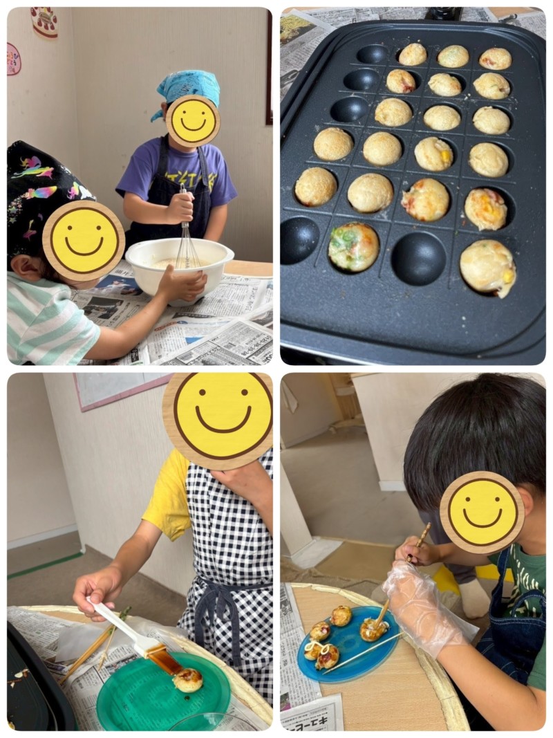 夏休み後半になり、まだ猛暑ですが、おやつ作りで「たこ焼き作り」を行いました。